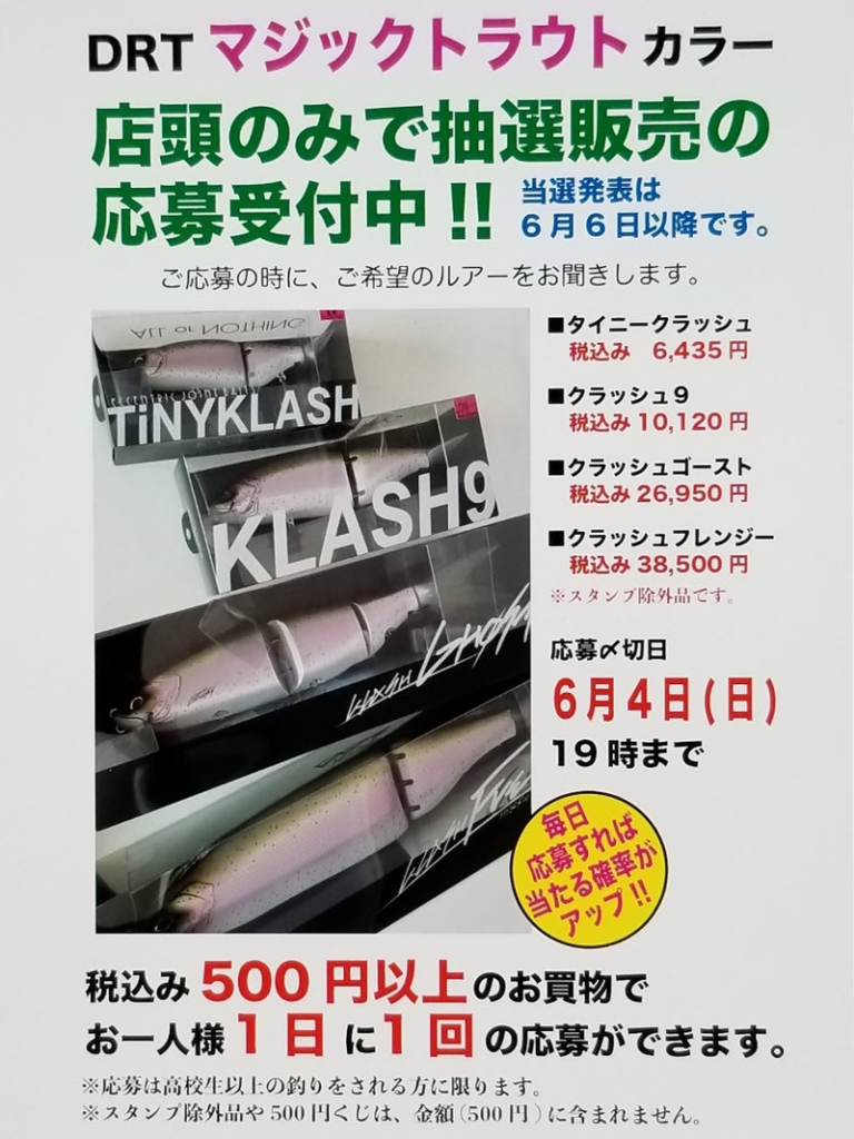 - 2023年5月24日~6月4日 アンドウ タイニークラッシュ/K9/ゴースト/フレンジー マジックトラウト 店頭抽選